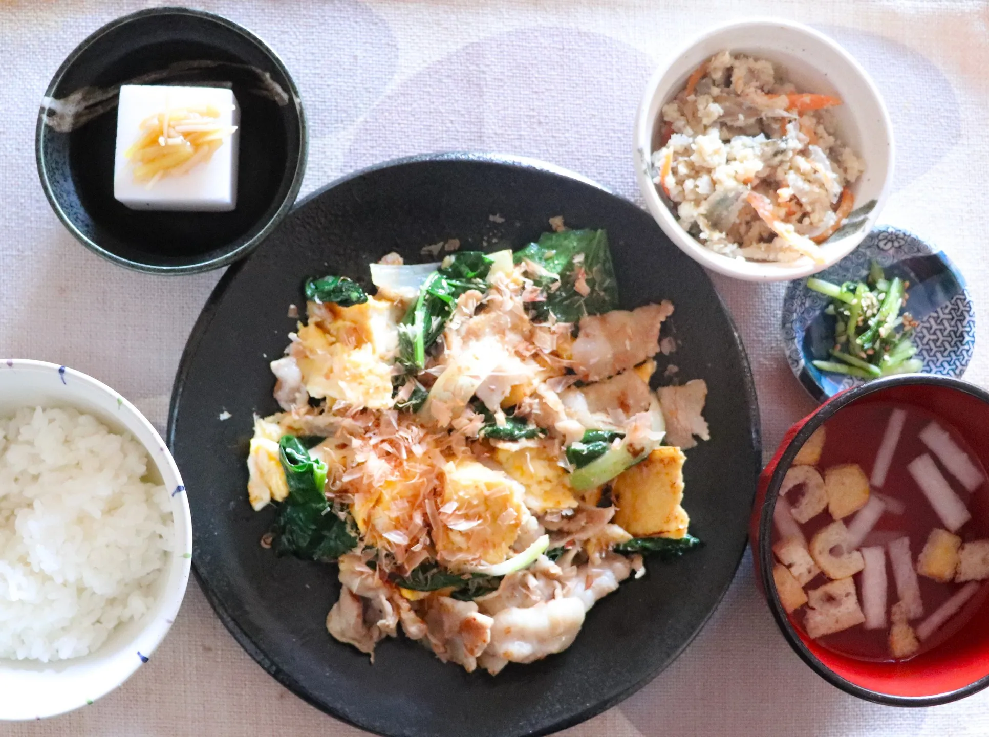 本日のランチは豚バラ厚揚げたまごのチャンプル!